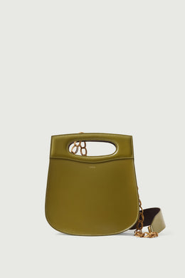 CHERI is one of our iconic bags, recognisable by its moulded oval handle. This bag is a daily companion, wearable by hand, over the shoulder, or crossbody. It has two removable and interchangeable straps: a gold chain with a leather patch, and a cotton strap of adjustable length.