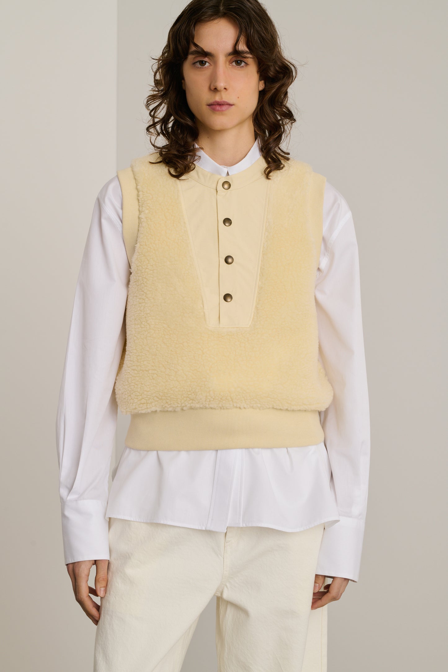 BAILA is a sleeveless sweatshirt made from faux fur. Its straight cut, subtly cinched at the hem, creates an elegant silhouette while providing freedom of movement. Perfect for layering or wearing on its own, this sweatshirt combines warmth and style.